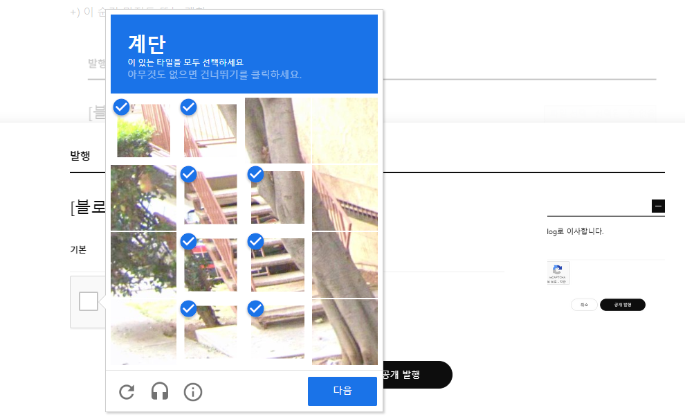 - 22년 부터 티스토리 글 업로드시 의무적으로 캡챠를 수행하는데(로봇 테스트용 그림 맞추기)